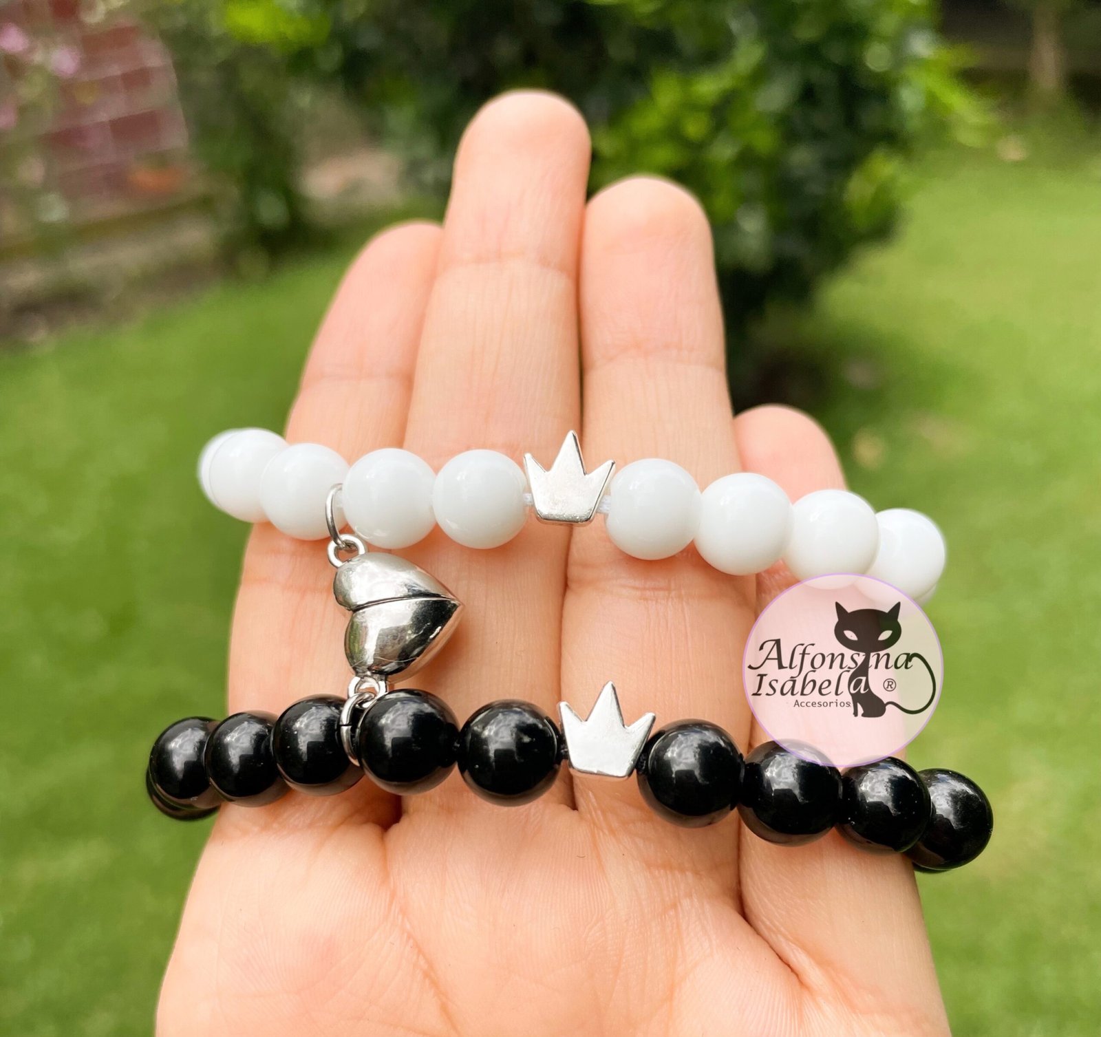CONTIENE: 2 pulseras con piedras Ónix + coronas plateadas + imán plateado en forma de corazón